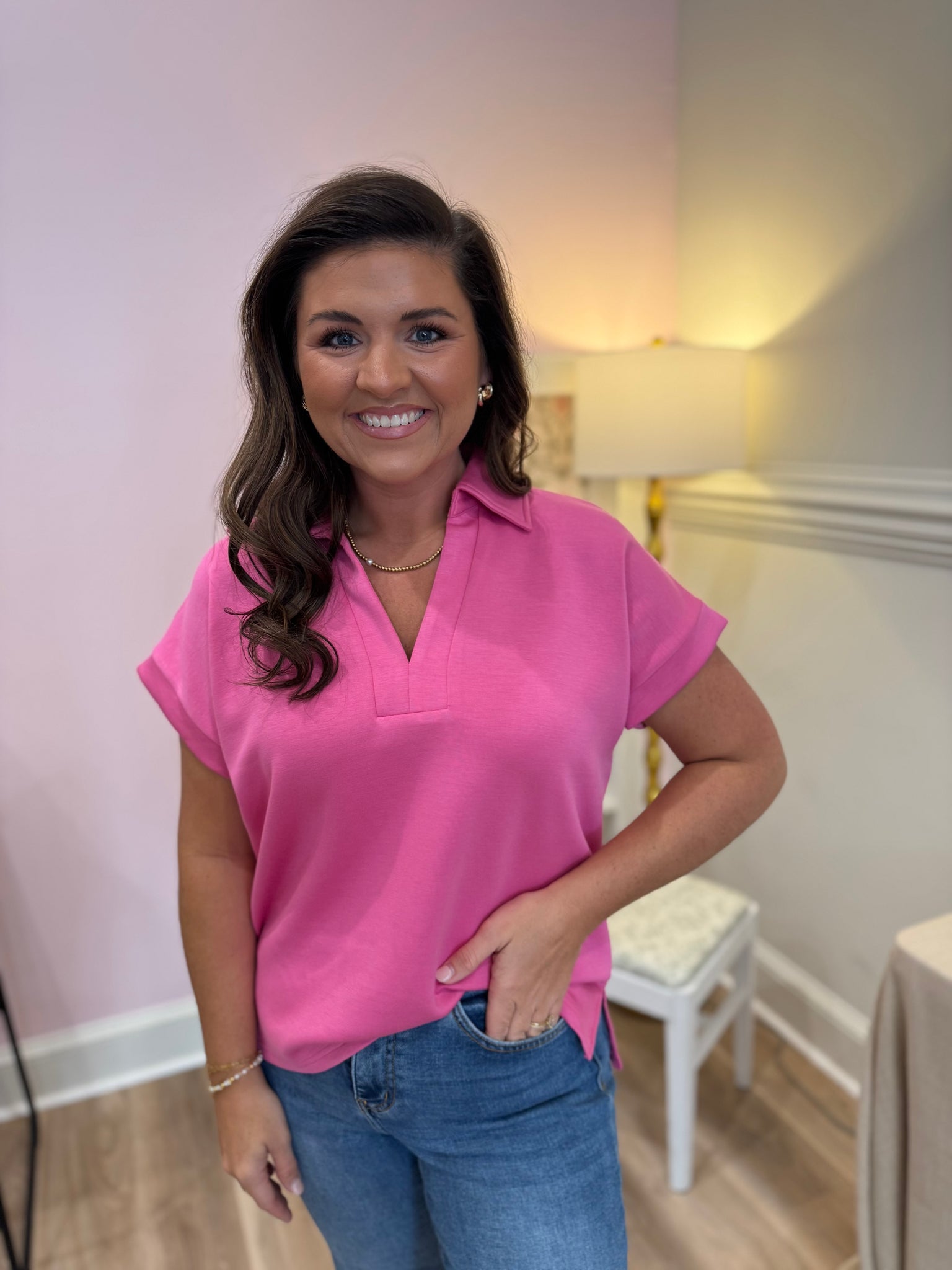 Solid short sleeve top featuring open collar V-neck. Unlined. Knit. Non-sheer. Lightweight.